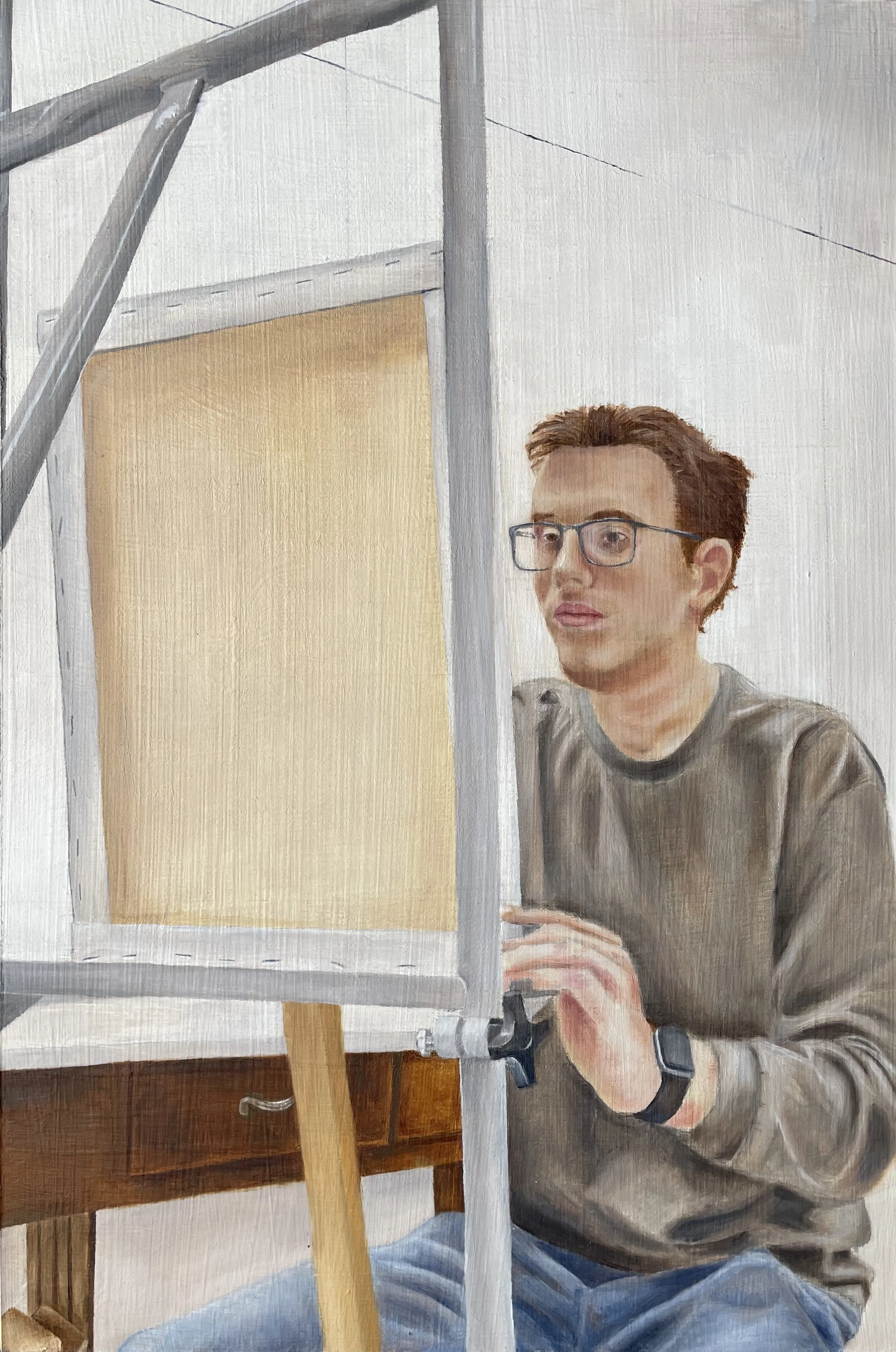This work represents a self portrait authetically portraying my foucs and delicate nature when it comes to painting with the soft hand position and gentle stare as I create my work.